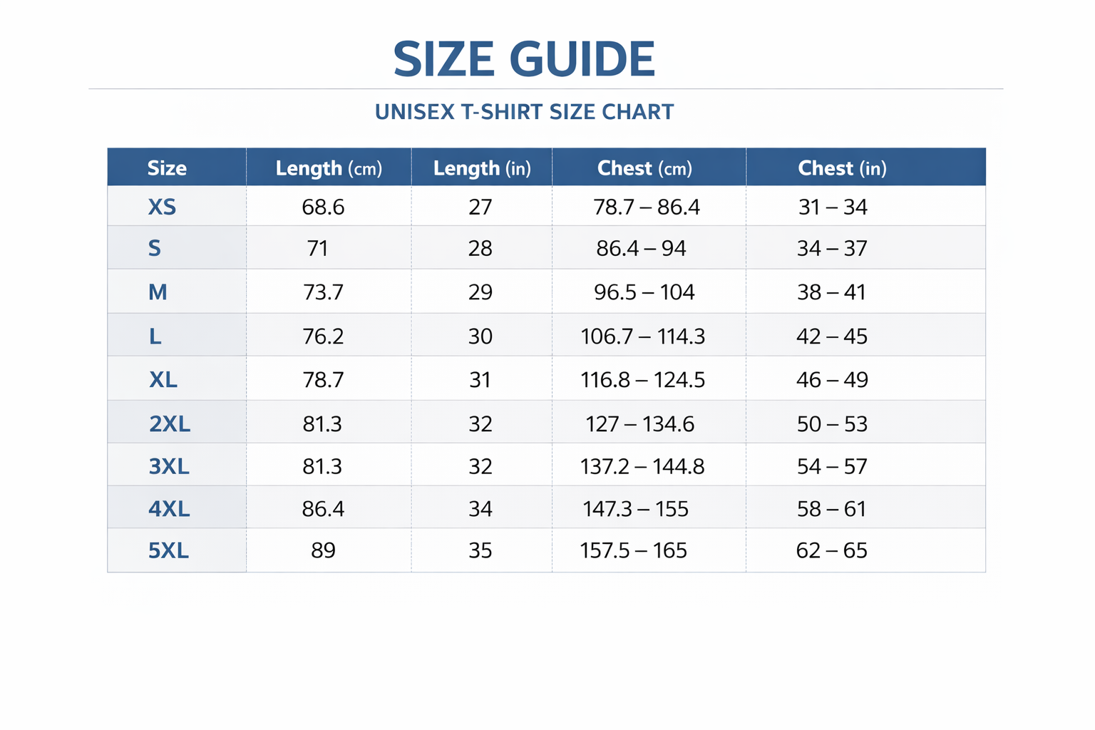 Measurements are provided in both centimeters and inches. Chest is measured around the fullest part of the body. For the best fit, compare with your favorite tee. If between sizes, we recommend sizing up for a relaxed fit.